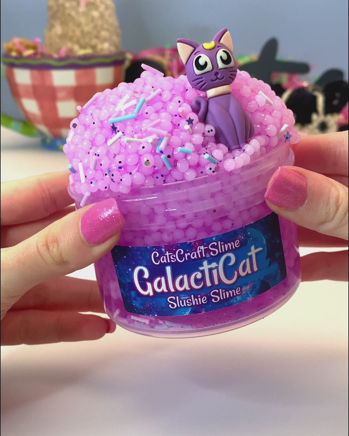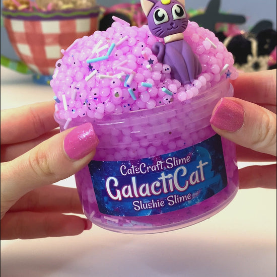 GalactiCat is out of this world! This crystal clear slime is filled with crunchy slushie beads that give the slime amazing bubble pops! It includes a random colored cute cat charm to brighten your day and a refreshing Pomegranate and Blackberry scent!