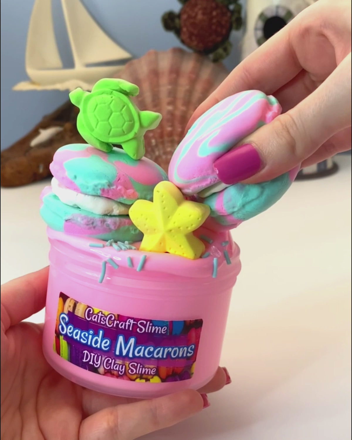 This stretchy pink slime comes with these adorable turtle and starfish plus 2 blue and pink marbled macaron clay pieces that mix into the thick glossy slime transforming it into a super soft butter slime!
