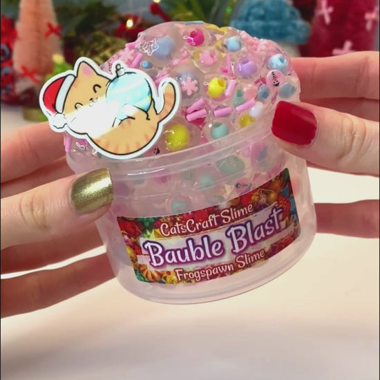 Get into the holiday spirit with our Bead Crunch Slime, Bauble Blast! This slime was inspired by how cats love to play with holiday baubles and ornaments. Stretch, pop, and enjoy the satisfying crunch of the rainbow frogspawn beads in the crystal clear slime base. It comes with an adorable cat charm. This slime is great for ASMR and perfect for Christmas!