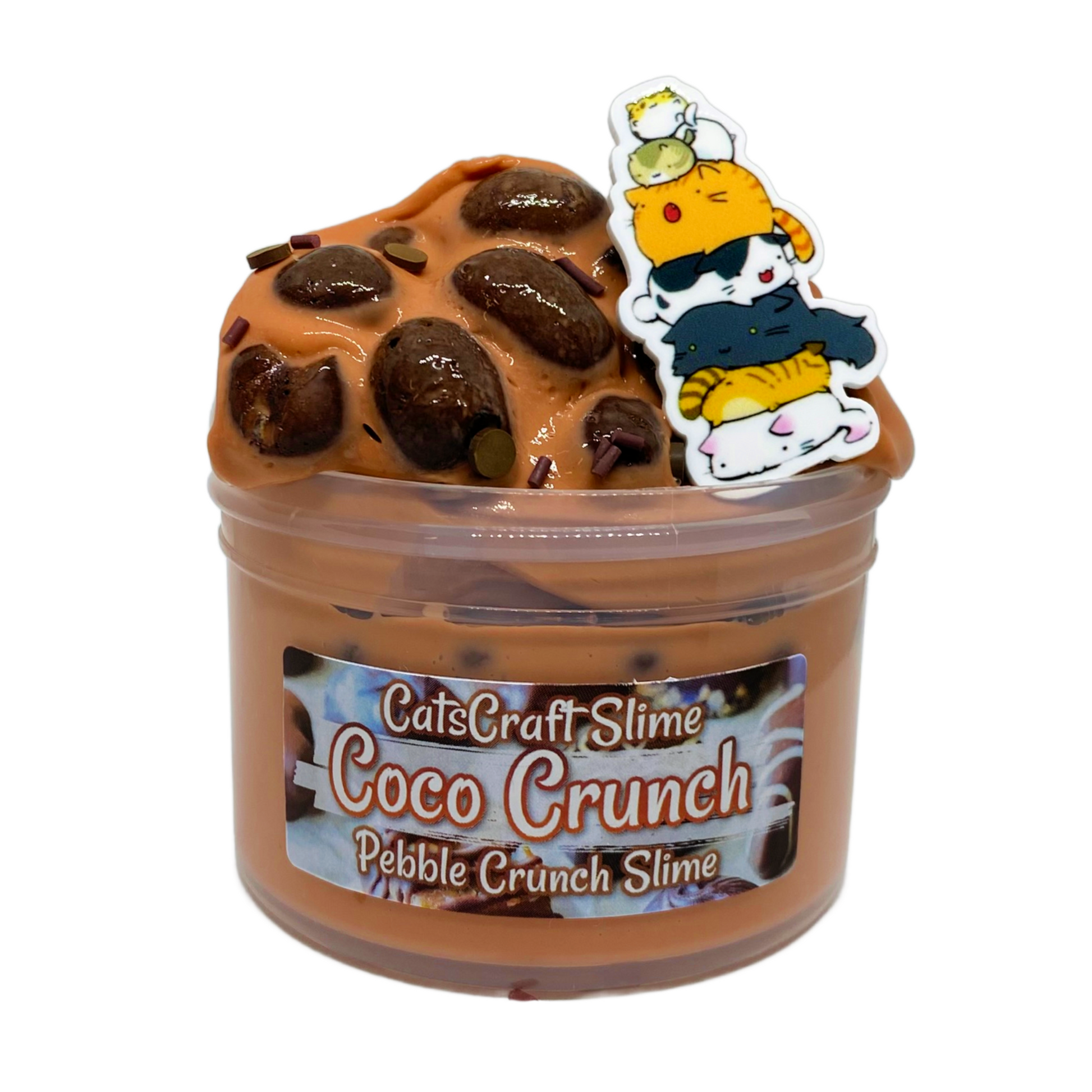 Coco crunch is filled with large pebbles that give this glossy slime a unique bubbly crunchy feel! It smells like a puffy chocolate cereal and includes the cutest stack of cats charm!