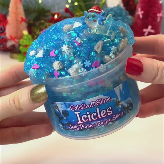 Dive into wintery fun with our jelly pumice bingsu slime Icicles! This slime has such a unique texture, the jelly slime feels soft around the crunchy pumice rocks and bingsu beads making it a unique sensory experience! Plus the peppermint and vanilla bean scent matches this slime purrfectly!