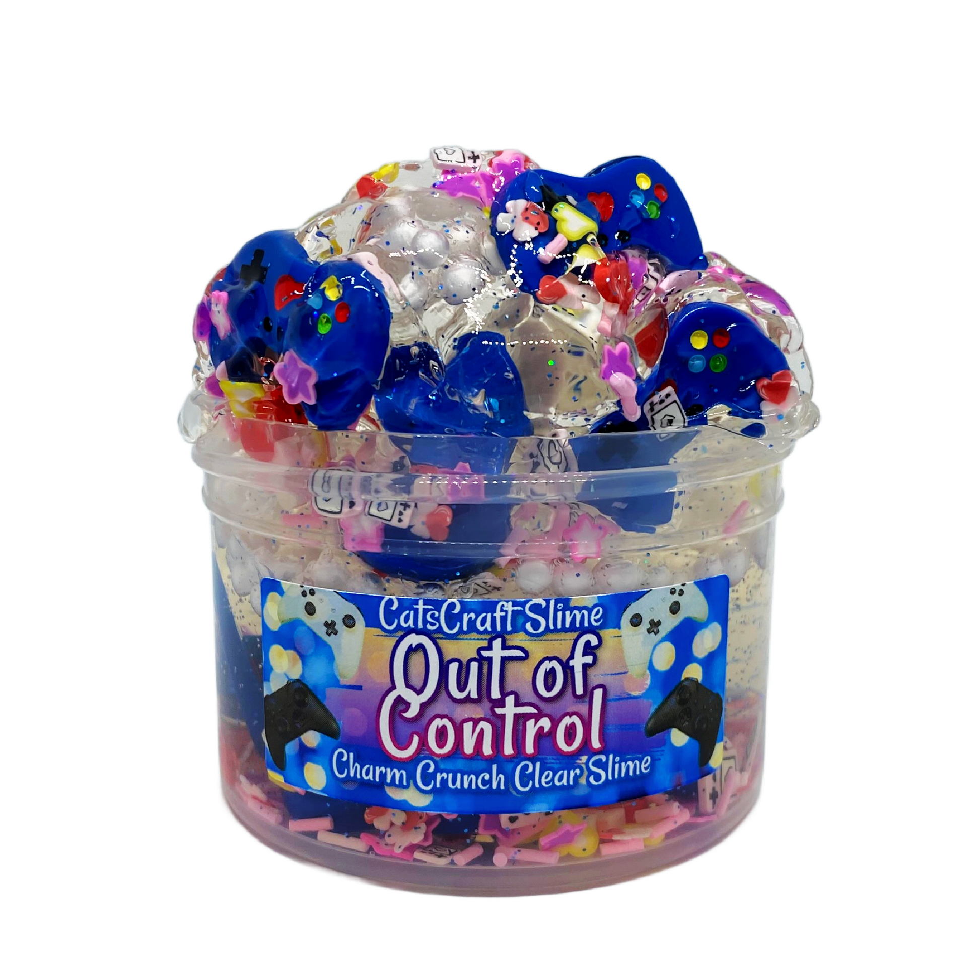 Get your hands on this video game themed slime Out of Control gamer Charm filled Clear Slime! This Orange Agave scented, stretchy slime includes 10 controller charms inside that add a fun crunch and colorful pop to your sensory experience. Perfect for ASMR this crystal clear slime also features very satisfying foam beads and bubble pops!