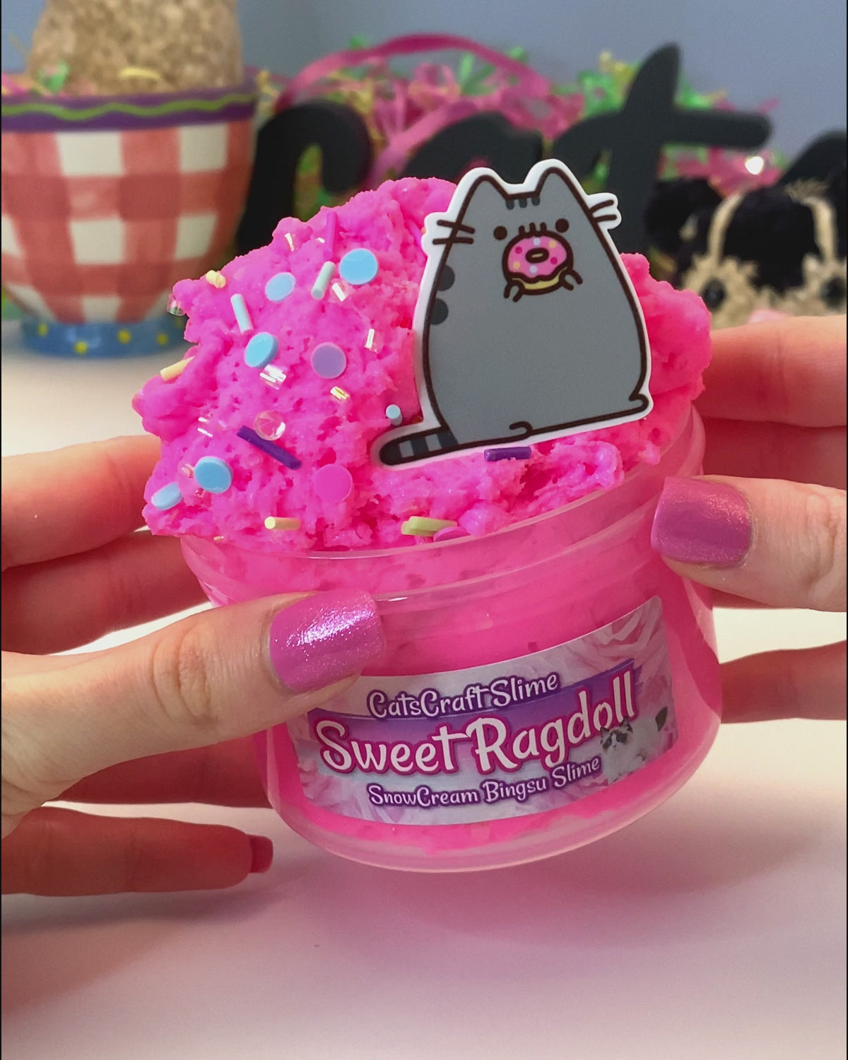 Experience our delightful Sweet Ragdoll Snow Cream Bingsu Slime it's soft with a hint of crispy crunchy texture from the bingsu beads inside! The Bingsu beads remind me of coarse sugar bits and they add so much inflation and sizzly sounds to the soft snowcream texture while the berry scent adds a playful, cozy smell. It's topped with an adorable cat donut charm and perfect for satisfying stress relief or just pure enjoyment!